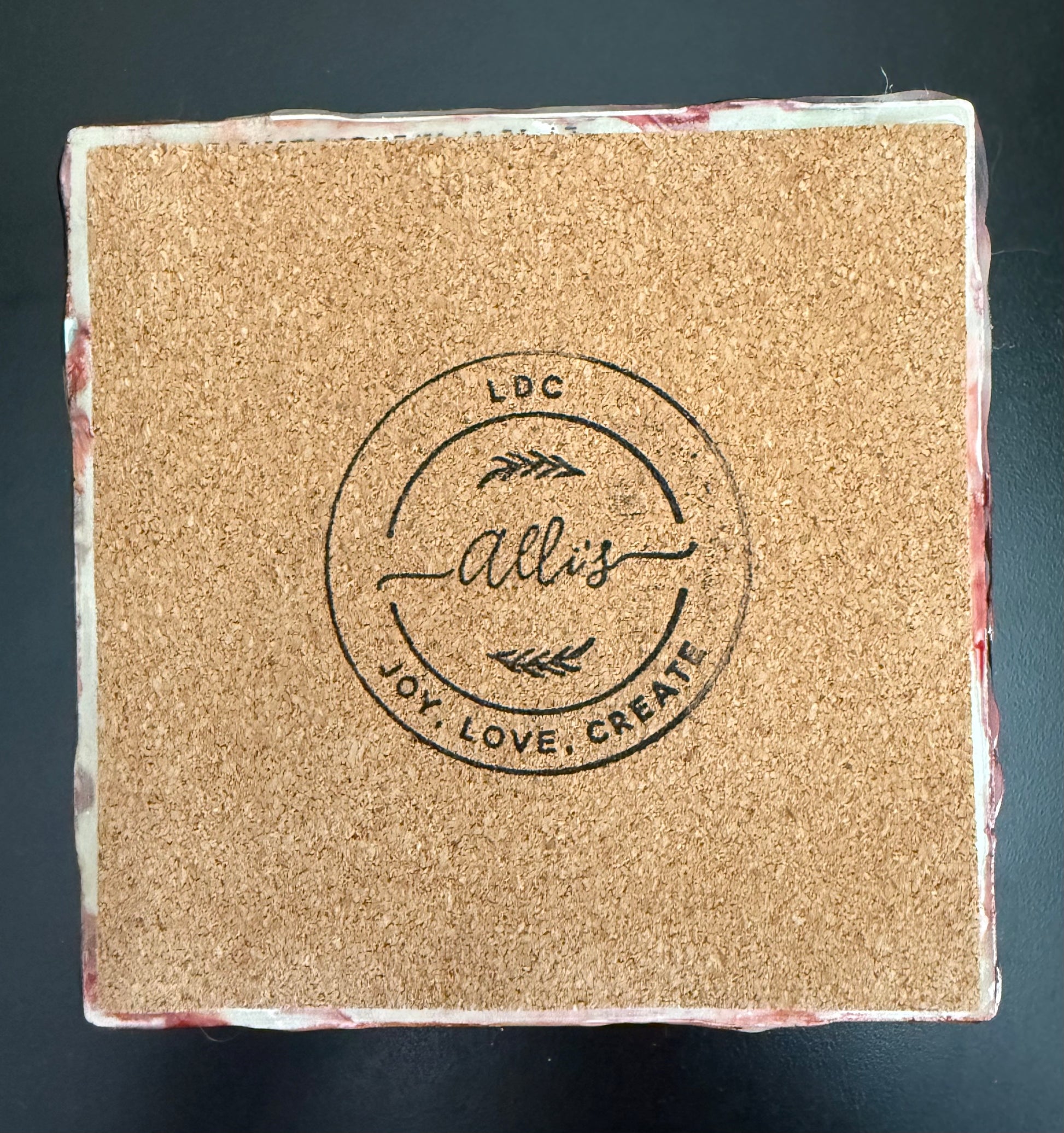 Set of 4 hand painted ceramic coasters in red, gold, and pearl. Coasters are coated with a food safe durable epoxy resin. Each coaster is roughly 4x4 backed with cork.